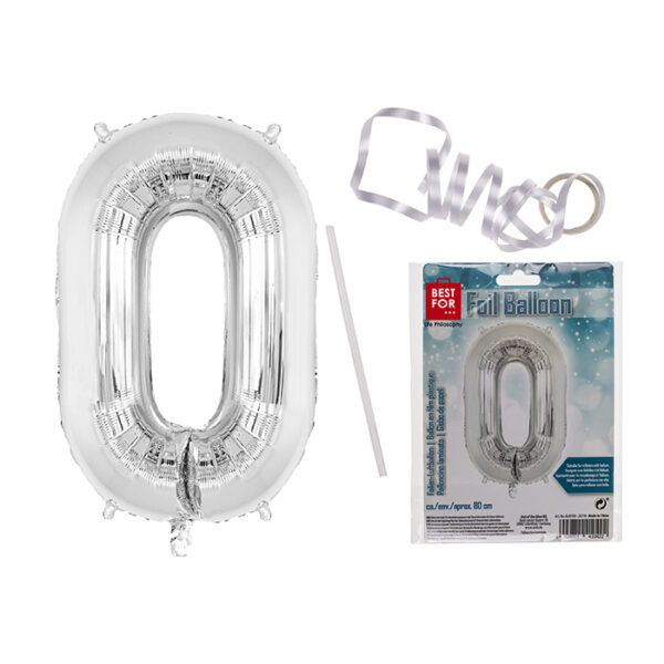 Ασημένιο Μπαλόνι Αλουμινόχαρτου, Αριθμός 0, 80 εκ., Ξαναγεμιζόμενα